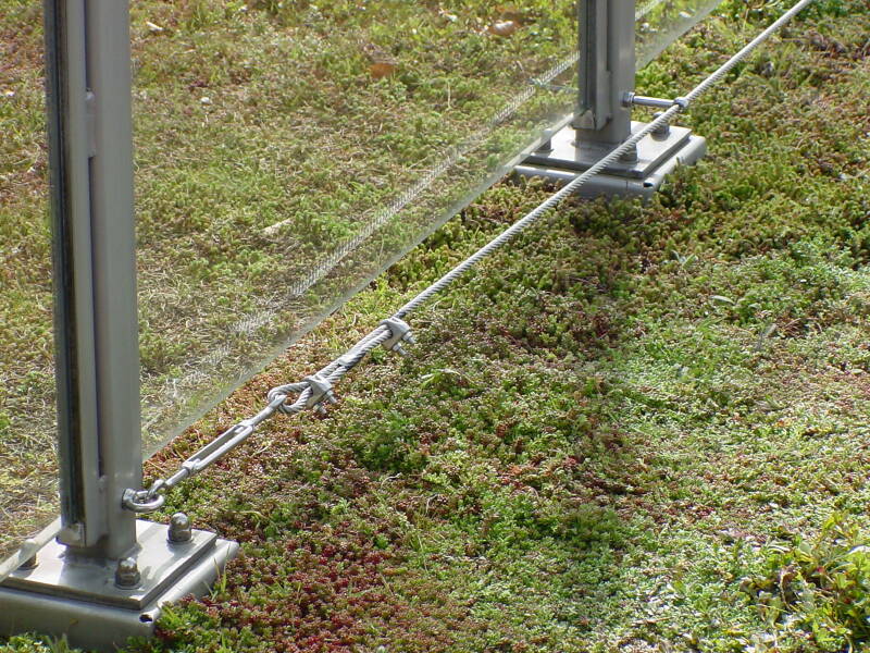 Op vrijdag 9 april 2021 heeft een metaalbedrijf een kabel met bevestigingspunten aangebracht op de balustrade van de glaswand. Hiermee wordt voldaan aan de veiligheidseisen om te kunnen werken op dit gedeelte van het dak. Nu kan de hovenier zijn sedumgedeelte met gebruik van valbeveiliging zijn werkzaamheden ook op dit gedeelte bijhouden.